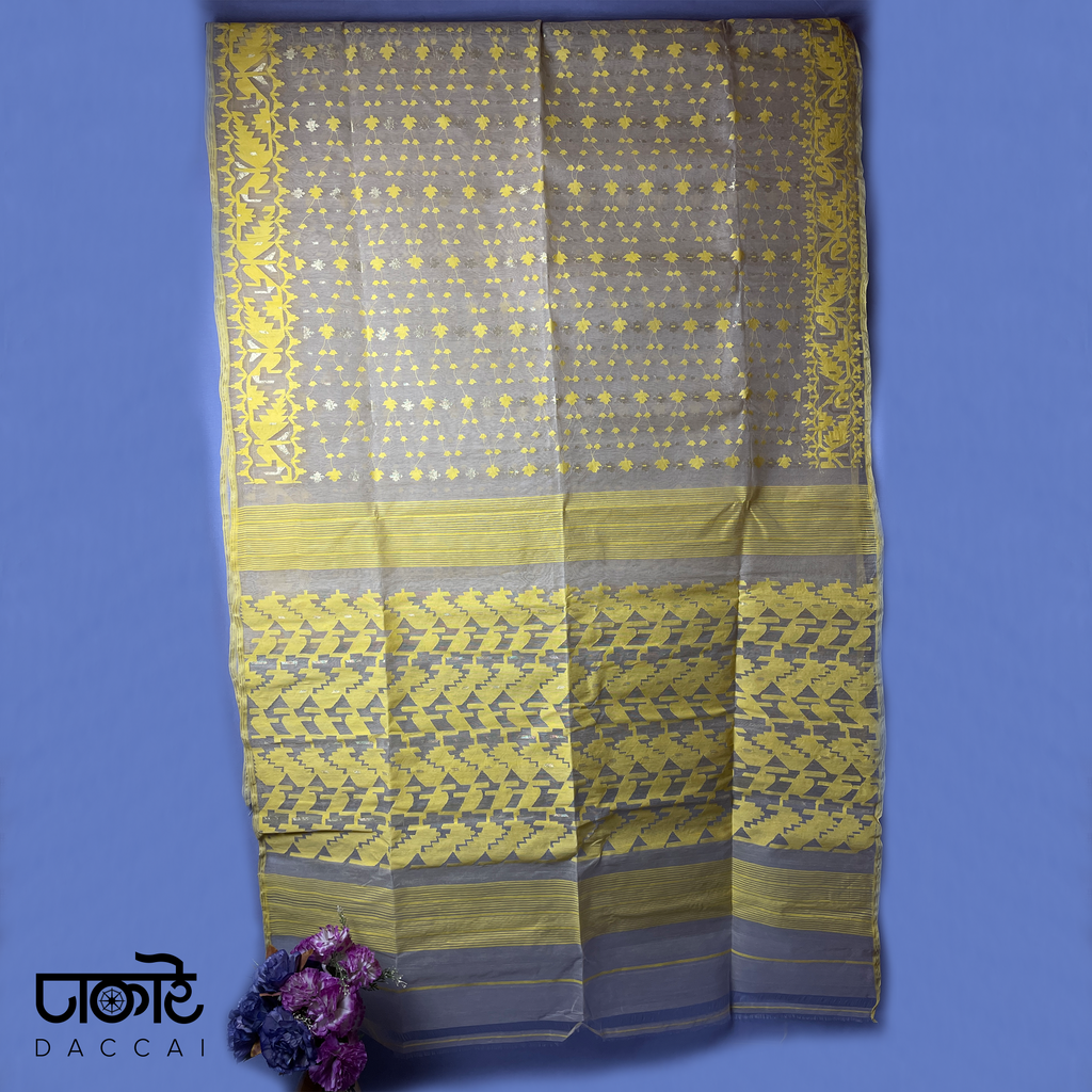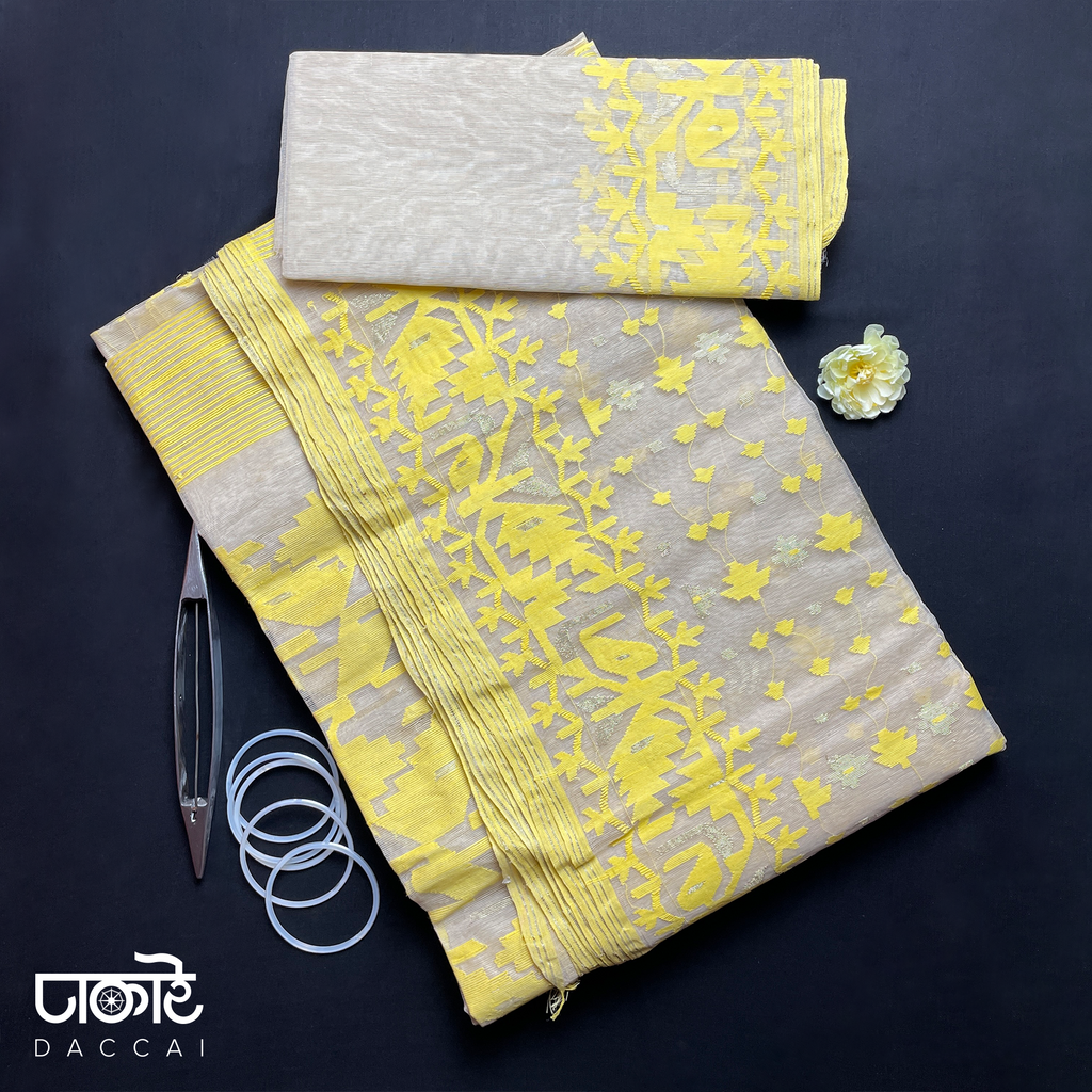 Handwoven cotton Jamdani saree in Ivory. This saree is Elegantly Woven with Ivory and Yellow work. Comes with a matching unstitched blouse piece. Accessories in the photo are a styling suggestion, it is not a part of the actual product.