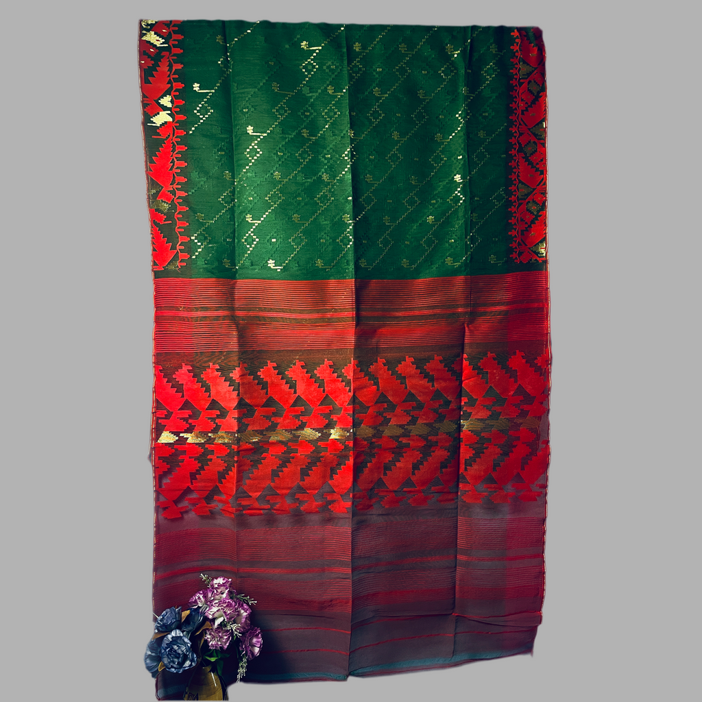 Handwoven Green half silk Jamdani Saree with green, red & golden Zari work.Ornaments in the photo is a styling suggestion, it is not a part of the actual product.