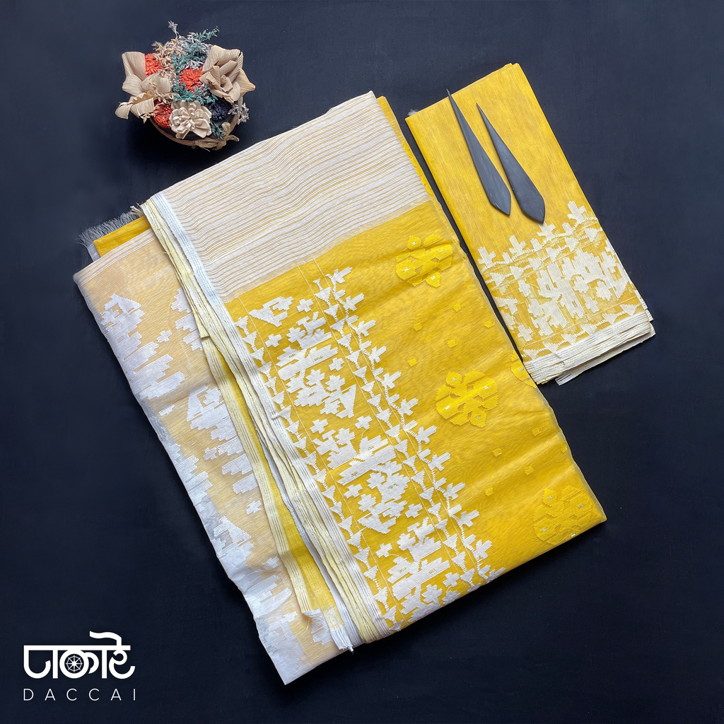 Yellow Jamdani Saree With White Contrast